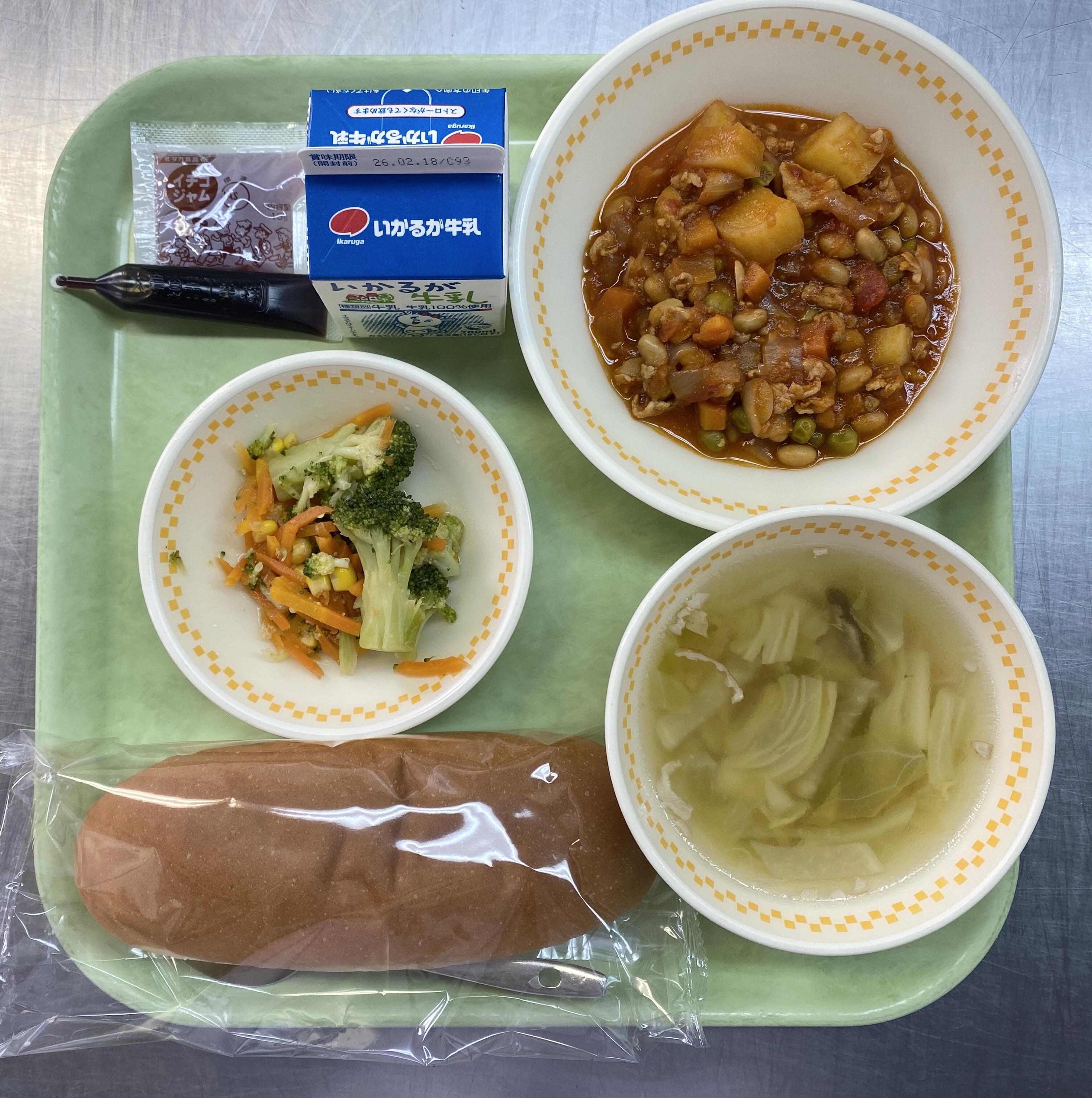 ミルメーク(コーヒー) コッペパン いちごジャム ポークビーンズ ブロッコリーのサラダ きのことハムのスープ |