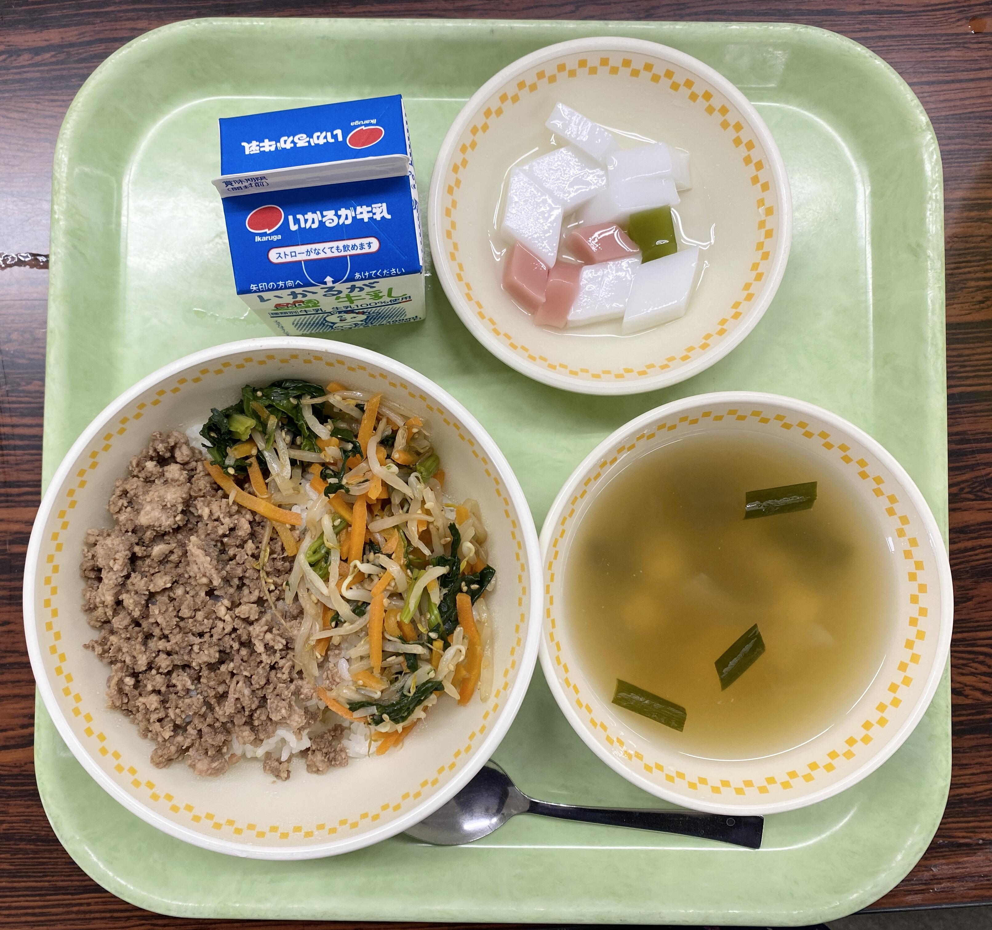ビビンバ とうふとニラのスープ さんしょくゼリー(あんにんふうみ) |
