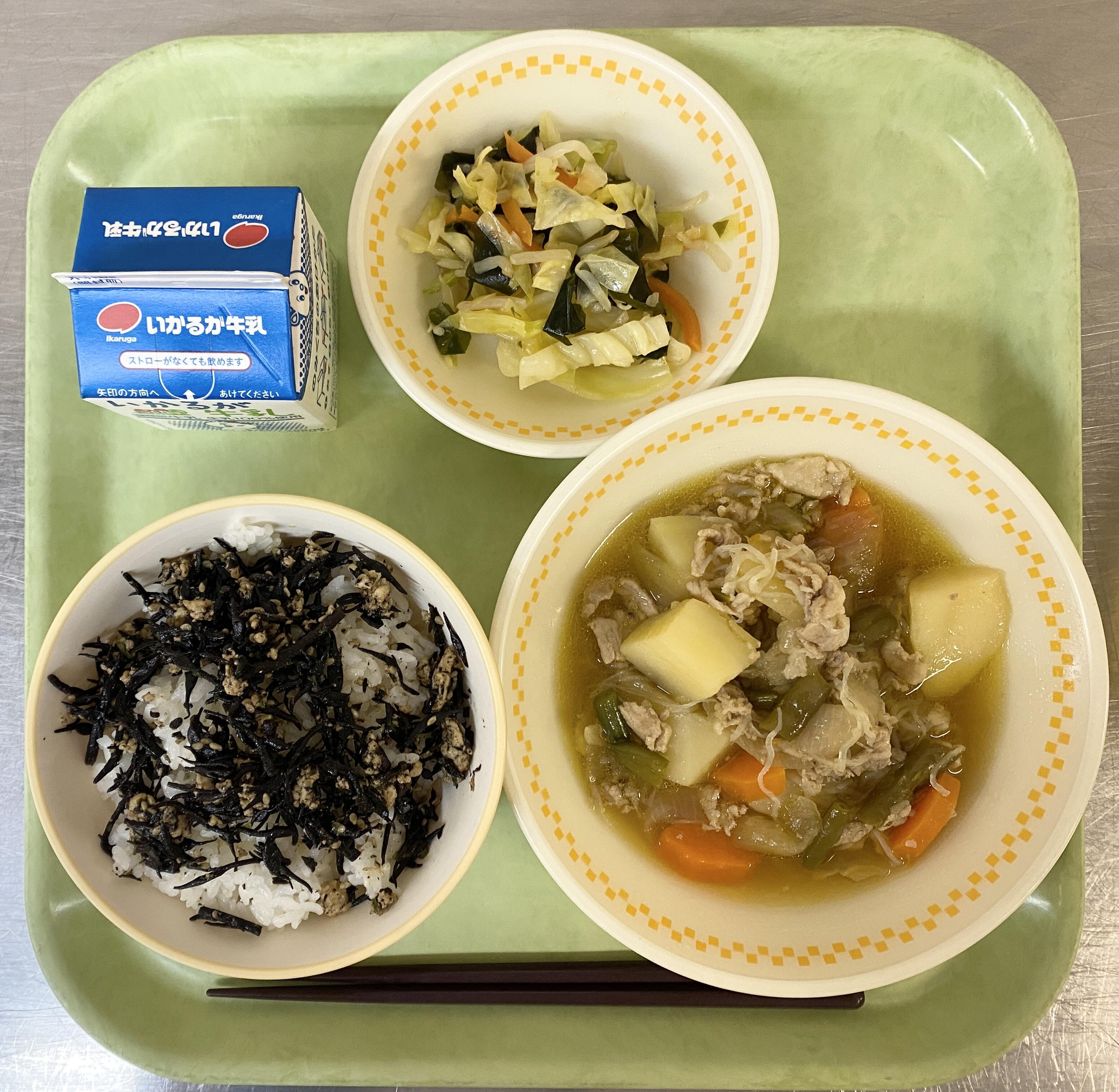 ごはん ひじきそぼろふりかけ ぶたじゃが キャベツとわかめのばいにくあえ |