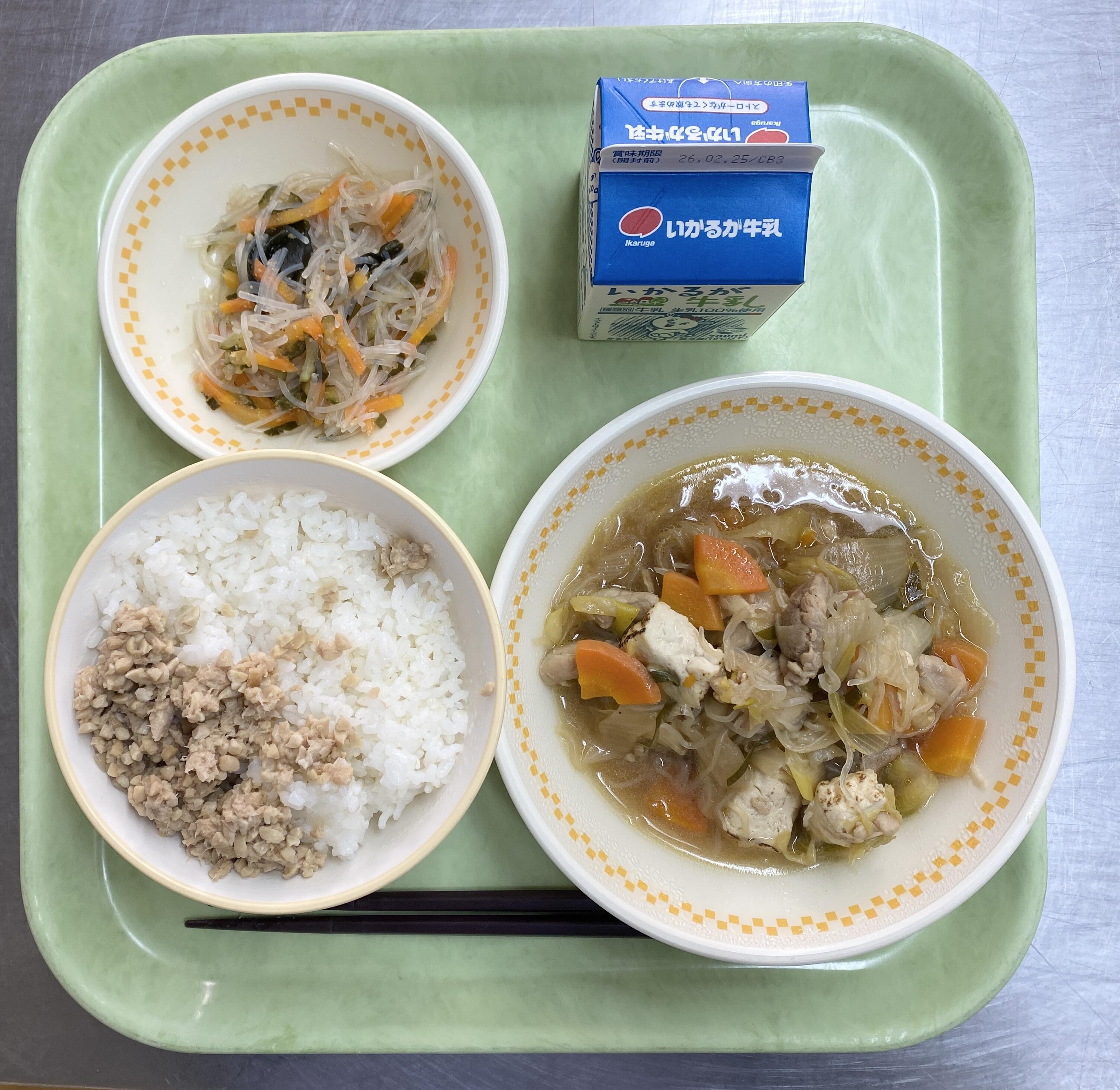 ごはん ツナだいずそぼろふりかけ かしわのすきやきふうに はるさめのすのもの |
