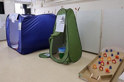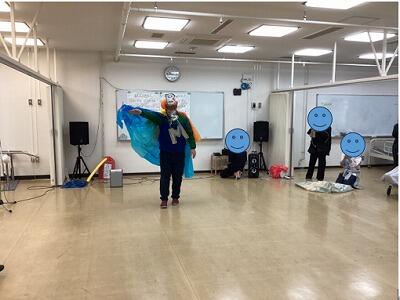 これまでPTA行事として実施してきた「A部門秋まつり」を、今年度は、内容を変更して、大阪府医療的ケア児支援センターの協賛のもと「防災フェスタ」として実施しました。防災の星からやってきた「防災マン」が、さまざまな災害の対応について話をしました。その後、みんなで防災音頭を踊って各ブースを体験しました。