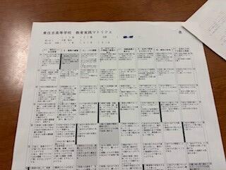 前期末考査初日10月6日(月)の午後、視聴覚階段教室にて本校共生推進教室に係る教職員研修を実施しました。テーマは「マトリクスの活用(評価と目標設定)」。各教職員が共生生徒一人ひとりの指導目標を知り、その目標に向けて様々な場面で指導・支援を実践することが目的です。本研修では、本年度当初に設定した指導目標及びマトリクス(=16あるカテゴリー毎の指導目標を段階別に示した表)の段階を確認し前期の評価を行うとともに、その評価をもとに後期の目標を設定します。