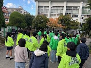 参加生徒の皆さんは午後3時30分に正門前に集合。少人数のグループに分かれ、学校オリジナルの緑色と黄緑色のウインドブレーカーを羽織り、軍手をはめて、火バサミと大阪市クリーンUP用ゴミ袋を持って予め決められた方面に出発。空き缶、ペットボトル、吸い殻等のゴミを収集して周りました。