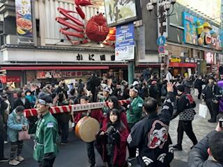 「宝恵駕行列」は今から300年以上前の江戸時代元禄期以降に始まったと伝えられ、大阪ミナミの芸奴衆が派手に駕を繰り出して今宮戎神社に参詣したのが起源だそう。「封間」(ほうかん)や「太鼓持ち」と呼ばれる男芸者が駕の周りを囲み、「ホエカゴ、ホエカゴ」と掛け声をかけながら練り歩く姿は、華やかな大阪ミナミの冬の風物詩となっており、現在は芸能人やスポーツ選手、福娘などが参加し、商売繁盛を祈願する正月行事として受け継がれています。本校芸文生も例年この行事の鳴り物演奏のお手伝いをしており、今日も3年生の2名と教員1名が太鼓と鐘を鳴らしながら大阪の南の街を練り歩きました。