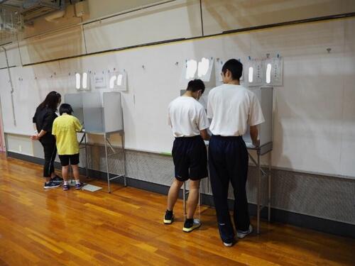 今回は、大阪市選挙管理委員会より記載台と投票箱をお借りし、実際の選挙さながらの環境で投票を実施しました。 本物の選挙道具を使うことで、3年生はもちろん、1・2年生にとっても将来の選挙を身近に感じる貴重な機会となったと思います。 信任投票ではありましたが、生徒たちは演説を真剣に聞き、それぞれの考えをもって投票に臨んでいました。