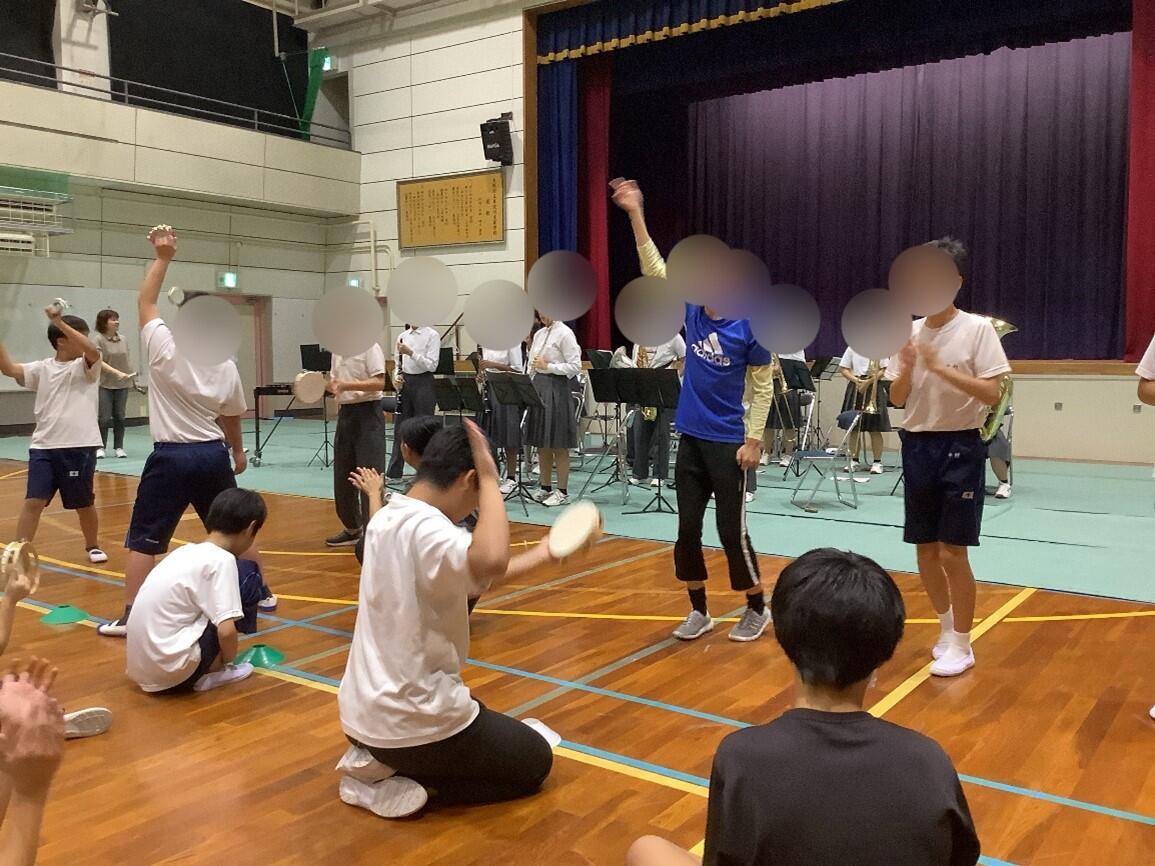 最後には、中学部の生徒たちもタンバリンやマラカスなどの楽器を持って「勇気100%」「新宝島」の曲に合わせて自由に楽器を鳴らしました。とても盛り上がって、思わず立ち上がって踊りだす生徒が何人もいました。