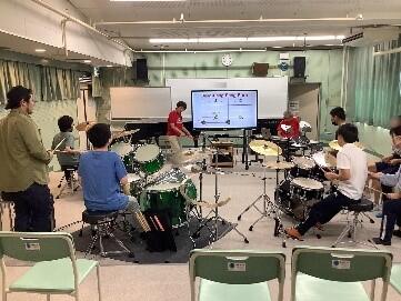 元大阪音楽大学教授の園田先生と、プロドラマーのシモンさんをお招きして、ドラムの出前授業を行いました。