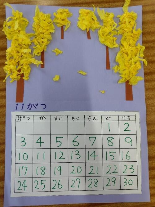 10月も終わりに近づいてきたこの時期に、作業の授業では11月のカレンダー制作を行いました。(毎月のカレンダー制作を活動に取り入れています。立体的な仕上がりにこだわって作っています!)