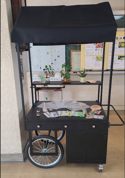 展示に使用しているかっこいいカフェ風のワゴンは、高等部の職業コースの授業で、生徒たちが一つひとつ組み立てたものです。