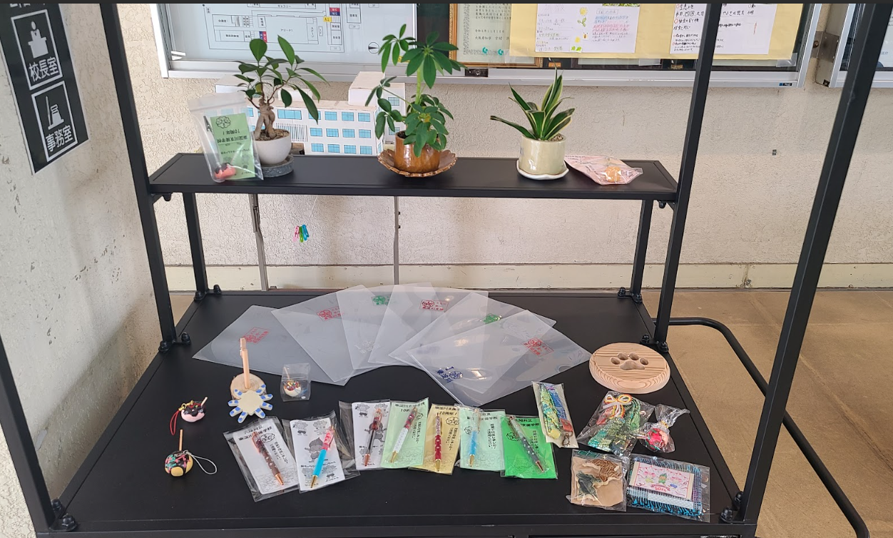 本校の玄関に、ひがよどブランドの製品を展示しています。