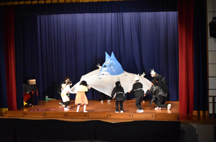 2年生の「トトロのまつり」では工夫をこらした大道具がたくさんあり、ビニールで作ったトトロが空気をはらんで飛び出したシーンでは歓声が上がりました。