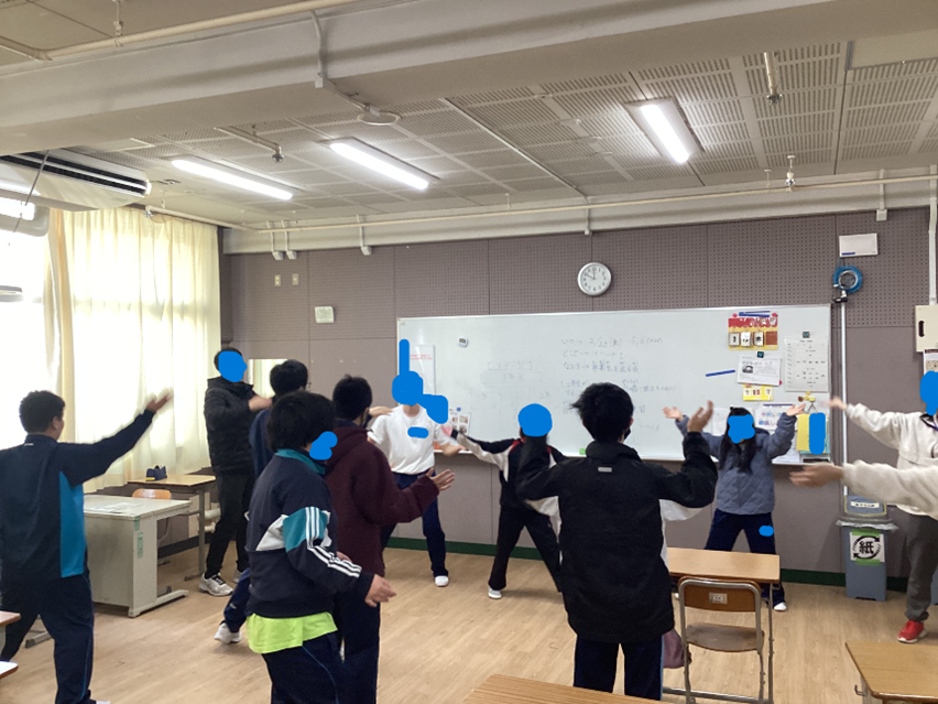 2年生が授業で取り組んでいるダンスを1年生も一緒に踊ることになり、総合の時間に数名の2年生が1年生の教室に来てくれました。2年生はお手本として実際に踊って見せてくれ、一緒に振り付けの練習にも参加してくれました。