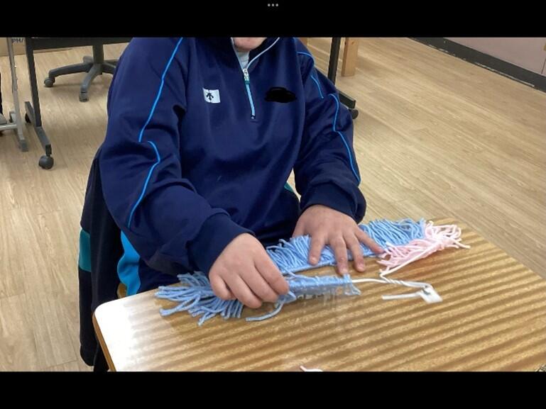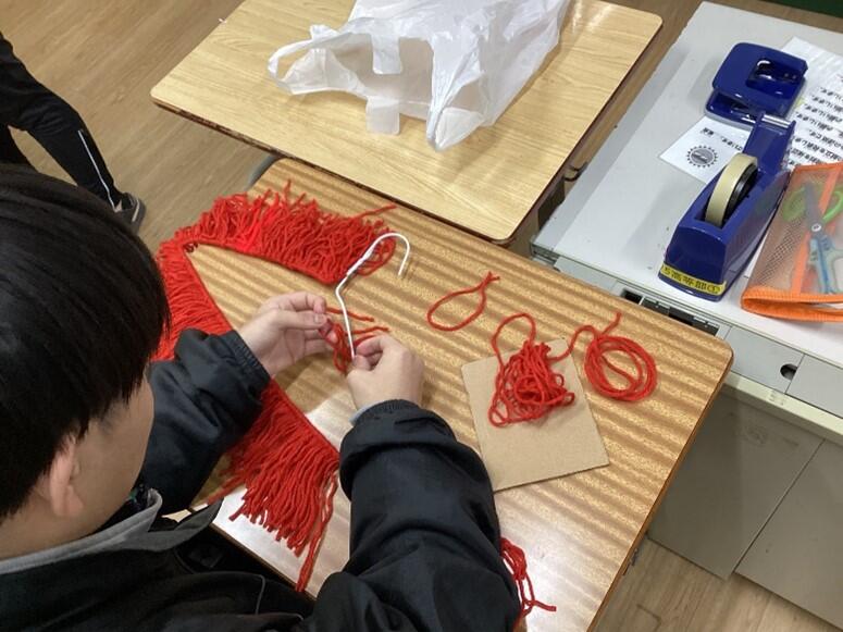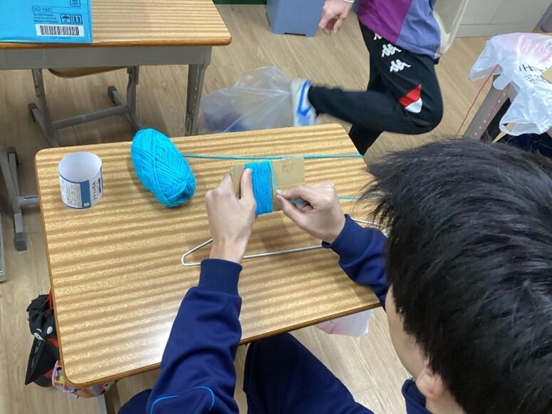 生徒たちは好きな色の毛糸を選んで丁寧に結びつけ、思い思いのデザインを形にしていました。