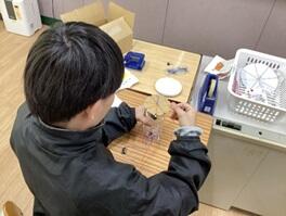 「組みひも」とは、数本の糸を決まった順番で交差させ、引き締めながら編み上げていくことで、1本の丈夫な紐を作る技法です。作業中は、糸が絡まってしまったり、順番が分からなくなったりして、「先生、分からない!」「絡まっちゃった!」と戸惑う声も聞かれましたが、みんな諦めず、順番を覚えようと一生懸命に取り組んでいました。完成した紐は持ち帰ります。保護者の方に生徒たちの努力のつまった作品を見ていただければと思います。