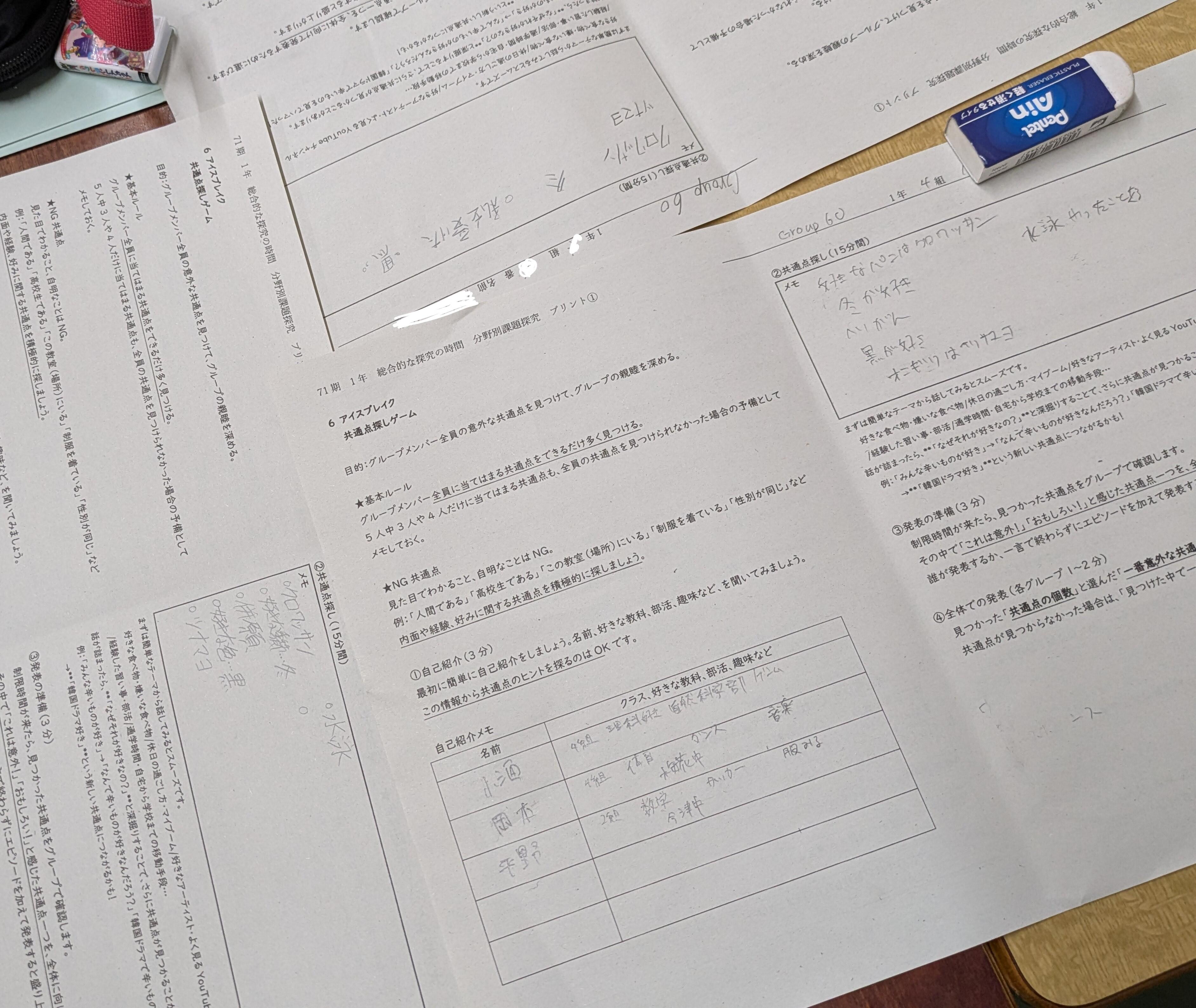 総合探求の授業では、クラスを越えて、興味のある分野ごとに別れて新しいグループで活動するプログラムがスタートしました。いつものメンバーとは違う新しい学年の友達と、それぞれ興味を持っている分野について研究テーマを決めて解決策について考えを深める活動をしていくことになります。