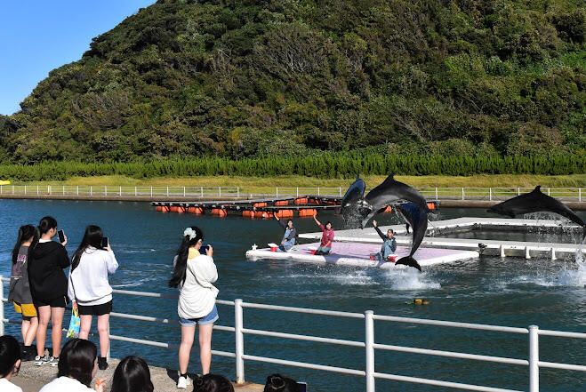 保護されたイルカたちが、かわいい動物たちと過ごしています。