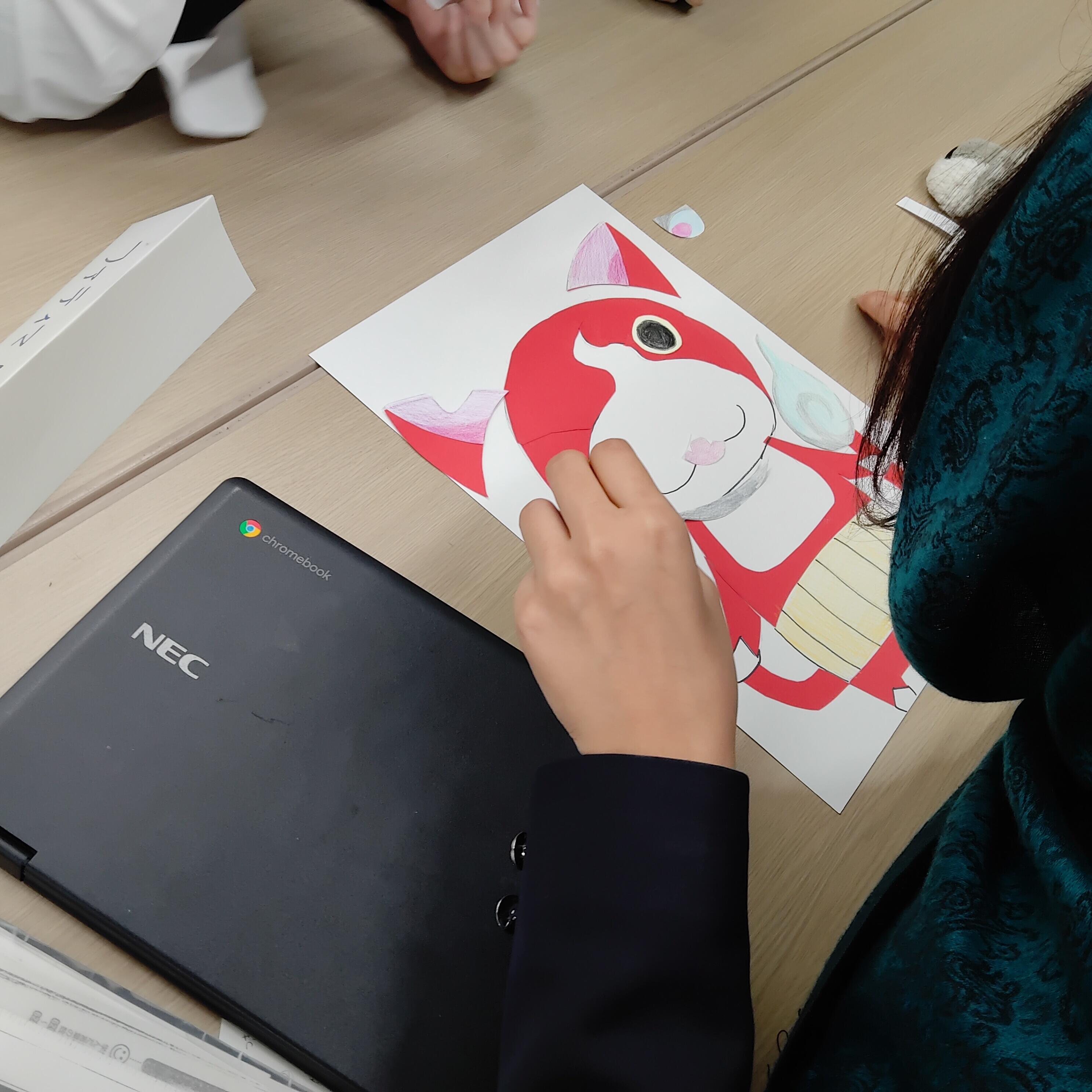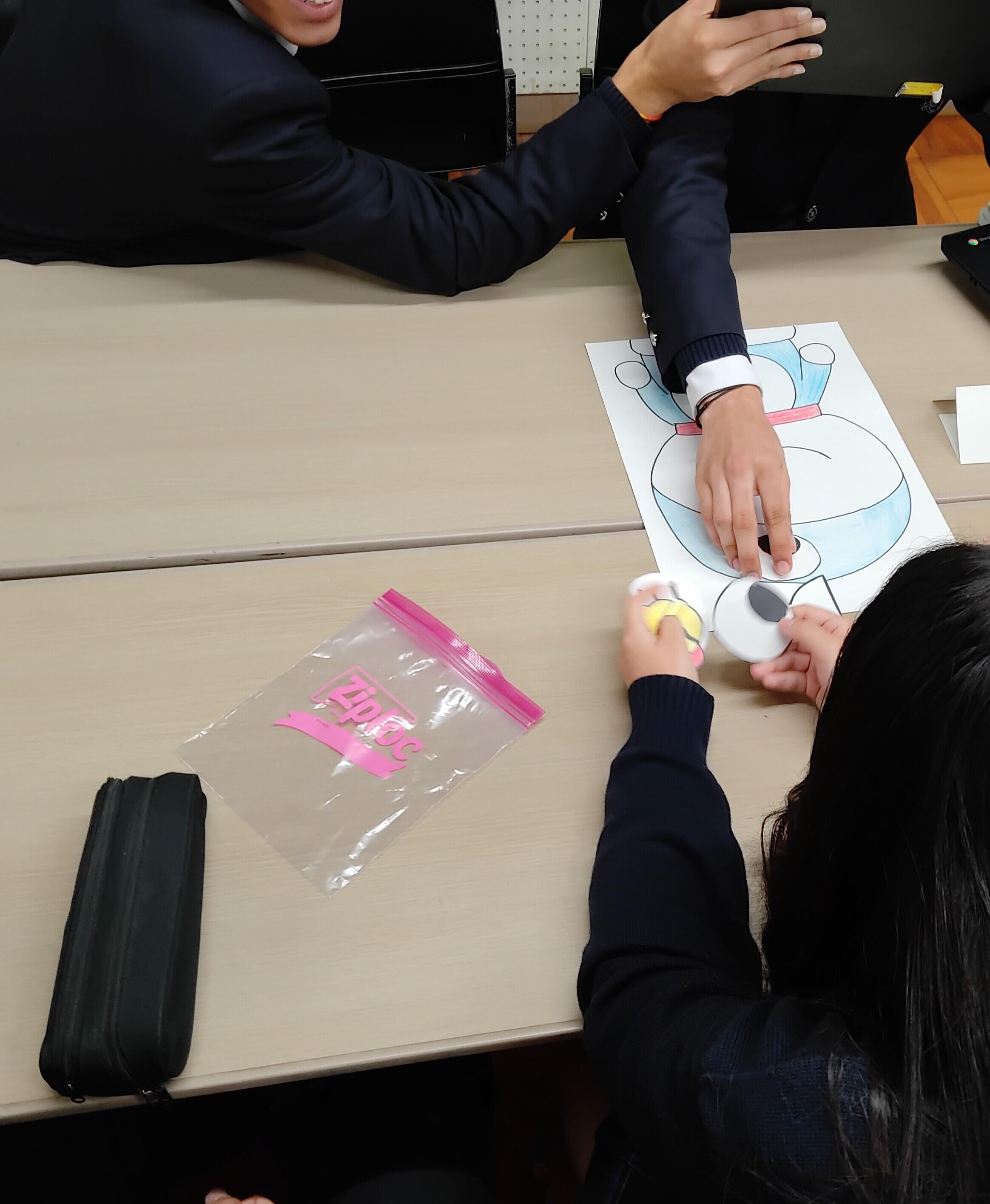 ・幼児教育コースの生徒たちが作ってくれたキャラクターの福笑いを多文化生徒が体験