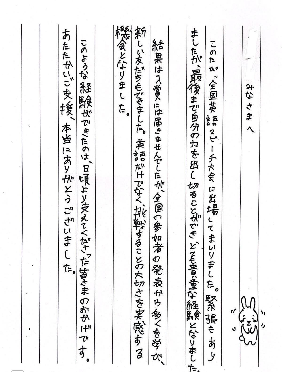 本人からご支援をいただいた皆さまへのお礼の手紙です。