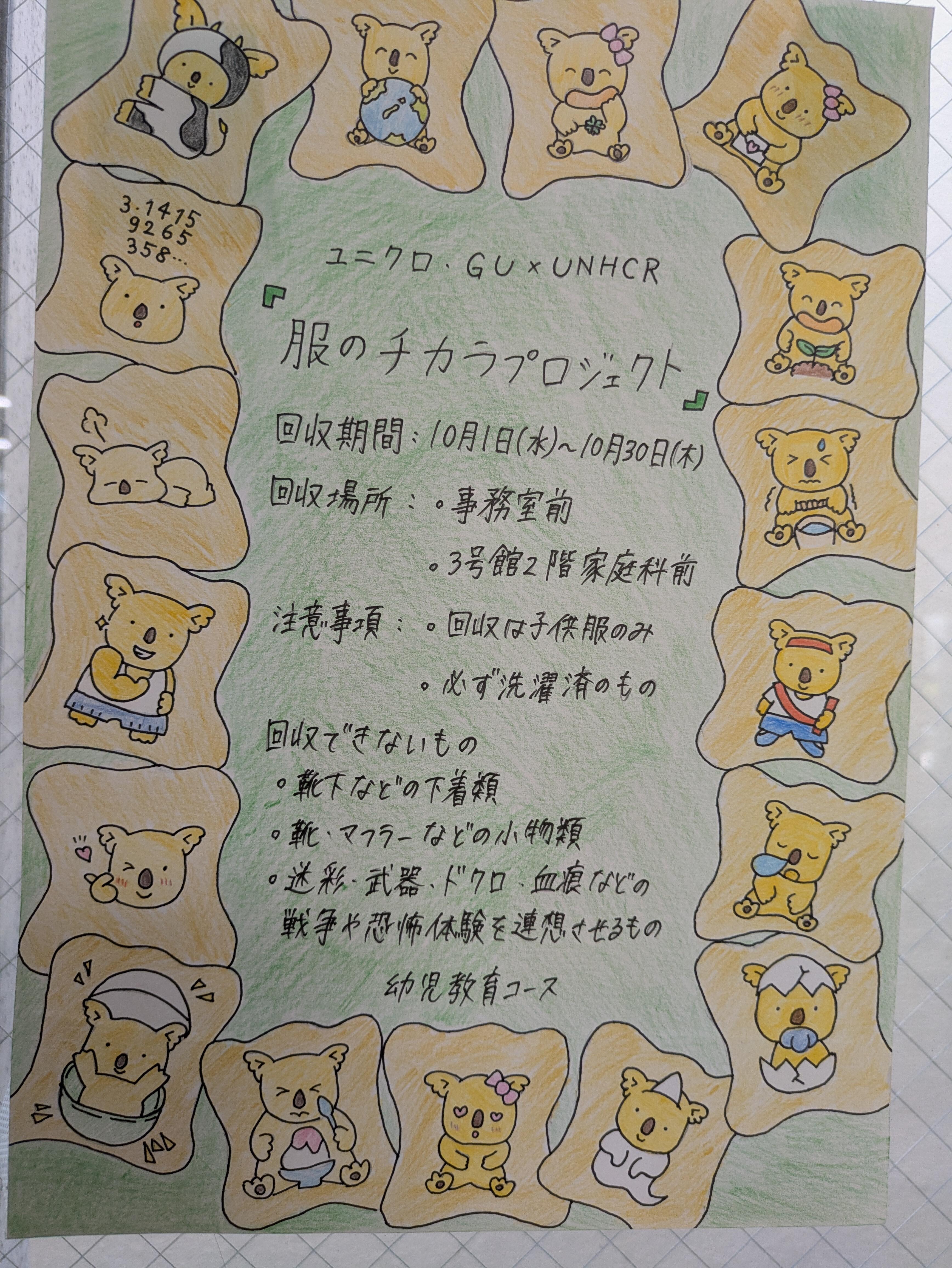 現在、幼児教育コースの生徒を中心に、ファーストリテイリング社(UNIQLO・GU)がUNHCR(国連難民高等弁務官事務所)とともに取り組む『届けよう、服のチカラプロジェクト』に参加し、不要になった子ども服を集めています。