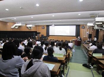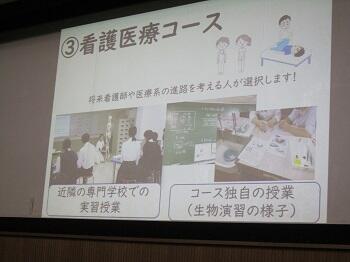 担当教員や生徒会執行部、くろーばぁ生、幼児教育・看護医療コースの選択生徒が、それぞれの立場から本校の魅力を紹介しました。説明の後には、校内施設の見学も行っていただきました。
