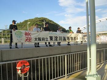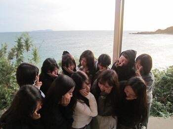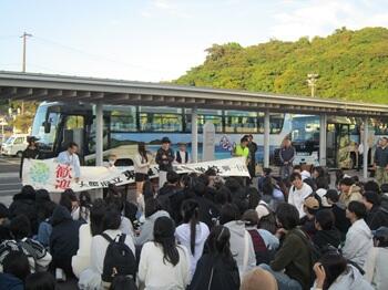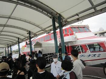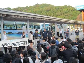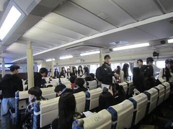 その後、再びバスで博多港へ向かい、壱岐行きのジェットフォイルに乗船。島では役所や観光協会の皆さんが横断幕を掲げて温かく迎えてくださり、入島式を終えた後、クラスごと民宿へ向かいました。