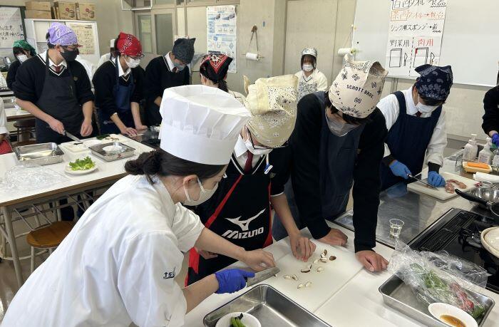 食材の処理の仕方から、様々なことを熱心に教えていただいていました。担当の方から、「とっても素直で、良い生徒さんですね」とほめていただきました。