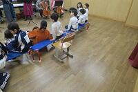 音楽室に入るとバイオリンやチェロなどあまり見たことがない学期がたくさん並んでいて、驚いている人が多かったです。「おどるぽんぽこりん」や「天国と地獄」「さんぽ」など聴いたことがある曲の演奏が始まると、身体を揺らしたり、バイオリンを弾く真似をしたりして楽しそうに過ごしていました。また、トライアングルなど知っている楽器に手を伸ばして触りたそうにしている人もいました。