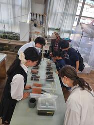 生物飼育部の紹介をした後、エサやりをメインに、魚の水換えなどを体験してもらいました。