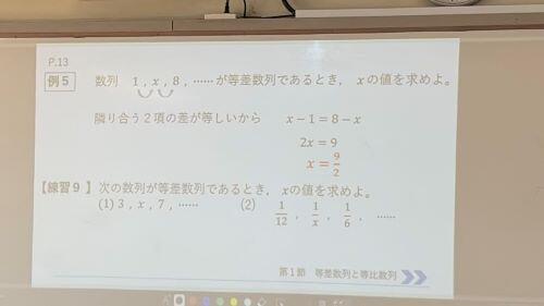 今日の4限目に2年生の数学Bの授業を見学に行きました。勉強していたのは「等差数列の和」でした。授業中に先生が何度も仰っておられた「教えられたことを丸暗記するのではなくて」、入試など初見の問題でも自分で解けるようになるには結局はこれに尽きますね。理屈が理解できていれば、たとえ公式を忘れても自分で考えて導き出すことができますから。あと授業の中で常に生徒同士で確認させておられましたが、とてもいいことですね。主体的で対話的で深い学びの基本ですが、みんなの前で先生には聞きづらいことでも友達になら聞けますから。枚高生の皆さん、人から与えられたものは失うのも早いですが、自分でつかみ取ったものはなかなか失いません。「自分でできる」ことにこだわる人になってくださいね。