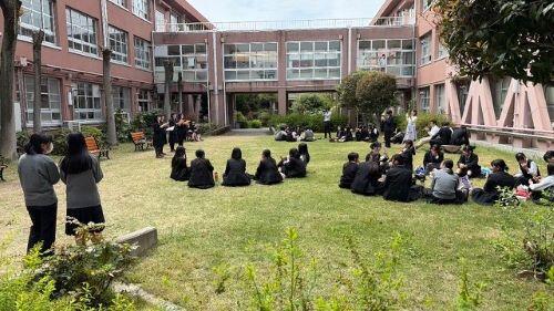 昼休みに中庭で音楽部の生徒たちがコンサートを行ってくれました。松任谷由実さんの「春よ、来い」、ジブリ作品「風になる」、カーペンターズ「トップ・オブ・ザ・ワールド」の3曲を歌ってくれましたが、爽やかな歌声が晴れた空と芽吹きつつある芝生に映えて、たいへん心地よい豊かな時間を与えてくれました。音楽部の皆さん、本当に素晴らしい歌を聴かせてくれてありがとう。また次の機会を楽しみにしています。