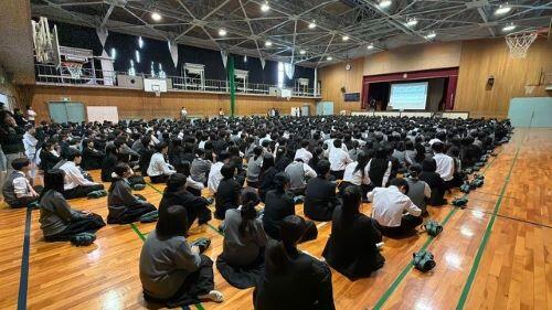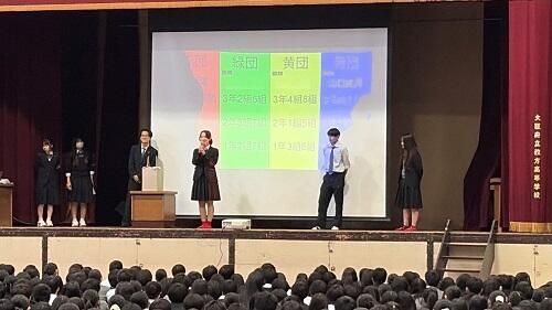 6限目終了後に3学年とも体育館に集まって体育祭関連の全校集会を行いました。最初に体育祭の団編成の発表があり、続いて応援団長の紹介、団カラーの抽選を行った後、最後に各団の団長から抱負が述べられました。体育祭に向けた活動はまだ始まったばかりですが、ここから体育祭本番までどんなふうに仕上がっていくのか、20数年ぶりに見る枚高体育祭ですのでとても楽しみです。