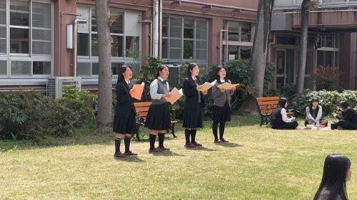 昼休みに中庭で音楽部の生徒たちが2回目のコンサートを行ってくれました。今日はMrs. GREEN APPLE「点描の唄」と「風になる」、「トップ・オブ・ザ・ワールド」の3曲を歌ってくれました。前回同様に、明るく爽やかな4人の歌声が、青く澄み渡った空と緑色の濃さを増した芝生に映えて、たいへん心地よい時間を過ごさせていただきました。音楽部の皆さん、今日も素晴らしい歌を聴かせてくれてありがとう。さらにまた次の機会を楽しみにしていますよ。