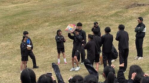 10時過ぎに現地に到着し、すぐに学年レクを行いました。予想した以上に寒風の吹く中、生徒たちは寒さを物ともせずにビーチフラッグやボールリレー、借り人競走で熱く戦い、好プレー珍プレーで大いに盛り上がりました。