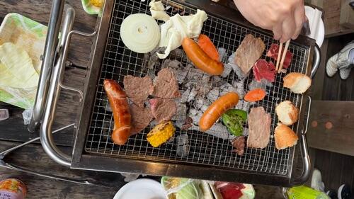昼食はBBQでお肉やウインナーをいただいたのですが、それぞれに好きなものをプラスして食事をたのしみました。