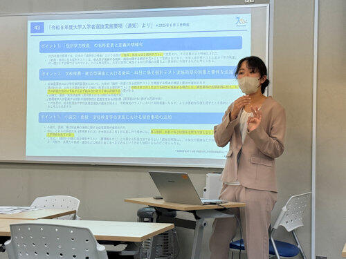 9月段階での各学年の特長について、スタディーサポートからわかる分析結果の説明がありました。そして、各生徒の可能性を見つけるために、FINE/Compassシステムをどのように活用していくことができるのかについて学びました。最後は、現在の入試概況について、変更点等の説明がありました。