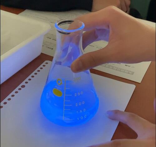 無色透明のルミノール溶液を入れたフラスコに鉄粉を加えました。