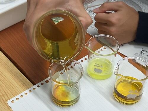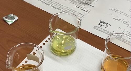 お茶を入れ始めた途端、ヨウ素液は変色(ヨウ素の色が消える)していきました。実は、ペットボトルのお茶には、酸化防止のためビタミンCが添加されていました。
