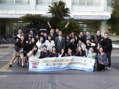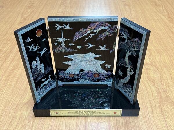 1月13日、韓国にある順天江南女子高等学校の1・2年生の生徒及び教員の一団が、はるばると本校へ、国際交流のため訪ねてきていただきました。韓国ソウル特別市にある崇礼門(南大門)をデザインした美しい螺鈿(らでん)により作られたミニ屏風と韓国のお茶をお土産としていただきました。ありがとうございました。