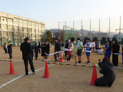 放課後のグラウンドのトラックと校舎の外周を回って、たすきをつなぎました。