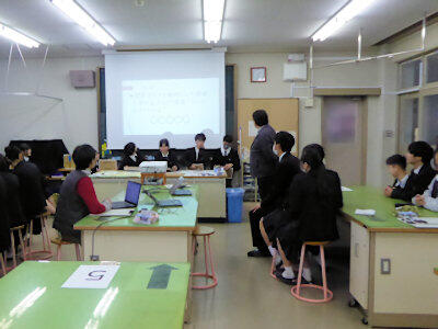 写真は、クラス対抗で、答えが5文字のクイズが出されて、5人の生徒が自分の席順に相当する場所の一語を答えるということを行っているシーンです。