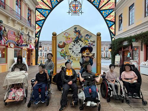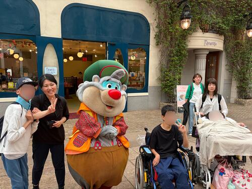 志摩スペイン村のキャラクターたちがエスパーニャ通りに集まり、笑顔で迎えてくれました。