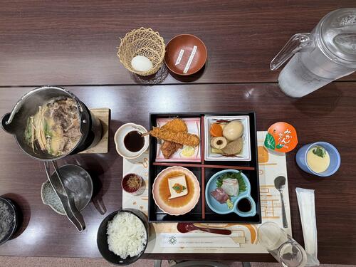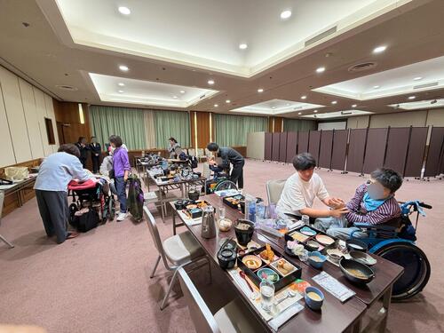 入浴を終えた後は、それぞれの部屋でゆったりと過ごしました。テレビを観たり、横になったりと、リラックスした表情です。 そろそろお腹が空いてきた子どもたちは、予定の時間より少し早めに部屋を出て、食事会場へ向かいました。 みんなの準備が整うのを待つ間にも、「まだかな?」とそわそわ。 当番の友だちの元気な掛け声に合わせて、「いただきます!」 テーブルいっぱいに並んだ料理を前に、笑顔でパクパク。 おいしいごはんに、心も体もほっこり温まりました。