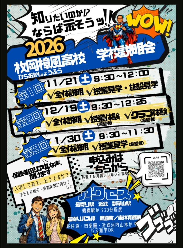 「知りたいのか!?ならば示そうッ!!」 枚岡樟風高校のリアル、見に来てください 第1回 11/21(土)9:30〜12:00 全体説明・授業見学・施設見学 第2回 12/19(土)9:30〜12:25 全体説明・授業体験(希望者)・クラブ体験(希望者) 第3回 1/30(土)9:30〜11:30 全体説明・授業見学(希望者) 生徒会執行部の生徒たちが中心となって、 "生徒のことば"でお届...