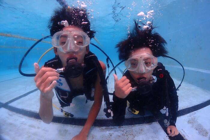 10/1(水)スポーツV スキューバダイビング体験 先週に引き続き、東大阪市のダイビングショップMAKO DIVEさんにご協力いただき、本校のプールにてスキューバダイビングの体験授業を実施しました。 先週よりも水温が2℃低くなっていましたが、今週はウェットスーツを貸していただき、快適に体験することができました! 水中での撮影した写真も提供していただき、みんなとてもいい表情で映っていました!...