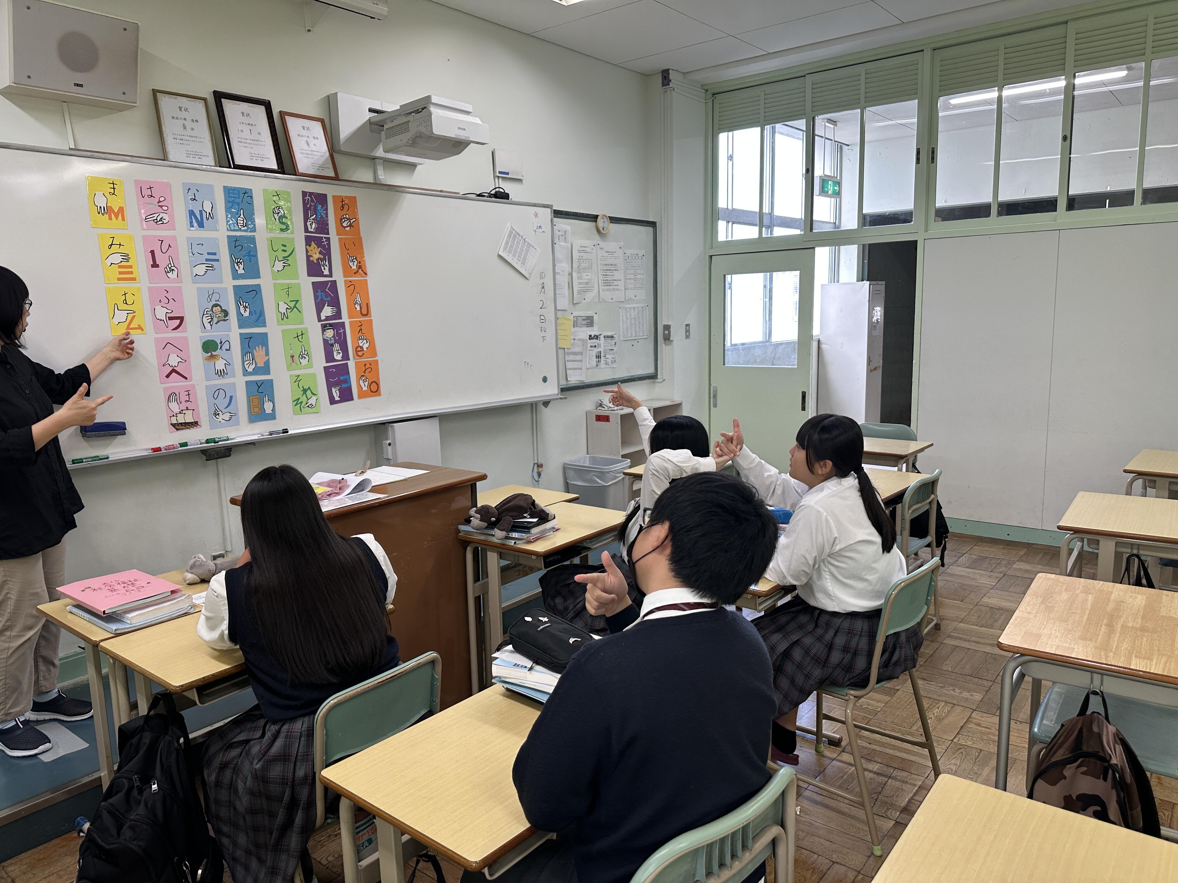 2時間の授業で、あいさつや誕生日、指文字の表現を学び、
