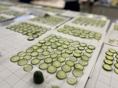 今回は、包丁技術を高めるため、家庭科食物技術検定をヒントに、技術テストを行いました。制限時間内で、きゅうりの薄切りが何枚できるか、というもので、いつもの楽しい雰囲気とは違った緊張感が漂っていました。そのあとは、お箸の技術ということで、小豆をお皿からお皿に移すテストを行いました。いよいよ生活科学の前期もラストスパートです。