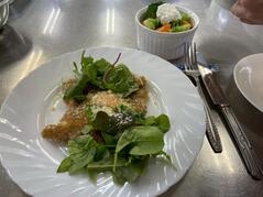 今回は、カフェメニューにチャレンジといテーマで、全粒粉を使ったガレットをつくりました。生地は、全粒粉にオリーブオイル、水、塩を加え、よく混ぜて、なじませておくことがポイントです。フライパンを温め、よく混ぜた生地を流しいれると、ジュっと音を立てます。表面が乾いたら、卵をのせて、ふたをして、火を通しました。周りを折り曲げ、カリっと焼き上げたら、お皿に移し、グリーンリーフをのせると、一気におしゃれなカフェメニューになりました。