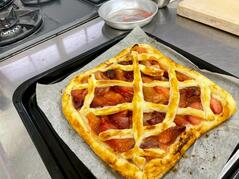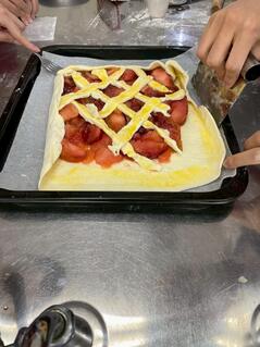 今回は、事前に準備したアップルパイの生地、りんごの砂糖煮で仕上げを行いました。パイ生地に砂糖煮を乗せ、残りのパイ生地を編み込み、りんごの上にのせて、じっくりと焼き上げました。調理実習室には、バターの芳醇な香りが漂って、贅沢な時間となりました。また今回は、作りやすい分量でつくったので、最近の生徒には馴染みのない「おすそわけ」として、普段お世話になっている担任の先生方に食べていただくことに...皆さんにとって、幸せな時間でした。