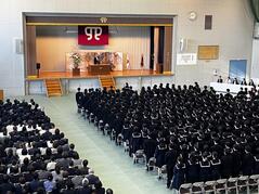 暖かな春の日差しのなか、始業式を終えた午後の体育館にて81期生の入学式が執り行われました。今年度は多くの保護者の皆様にも会場へお入りいただき、新しい制服に身を包んだ新入生をたくさんの温かな拍手で迎えることができました。体育館2階ギャラリーでの吹奏楽部の入退場曲演奏やステージでの第九ソリストによる校歌の披露など、先輩たちも新入生を歓迎しました。