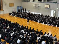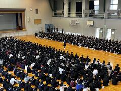 その後、生徒部部長より、春季休業中の活躍を讃えて、部活動やコンテストなどでの受賞者が紹介されました。男子バスケットボール部(茨木市大会2連覇)、女子バスケットボール部(茨木市大会準優勝!&優秀選手賞)、スキー部(スキー新人大会(アルペン、ジャイアントスラローム、クロスカントリー、総合の部など)、男子バレーボール部(西田杯北地区優勝、ゾーン優勝)、バドミントン部(公立高等学校大会ダブルス第3位、男子シングルス優勝、女子シングルス準優勝)、高校生研究発表会(優秀賞)、GLHS課題研究(大阪大学賞)、第13回ジュニア料理選手権(特別賞)、青少年人権作文(全国入選賞)、皆さん、おめでとうございます!